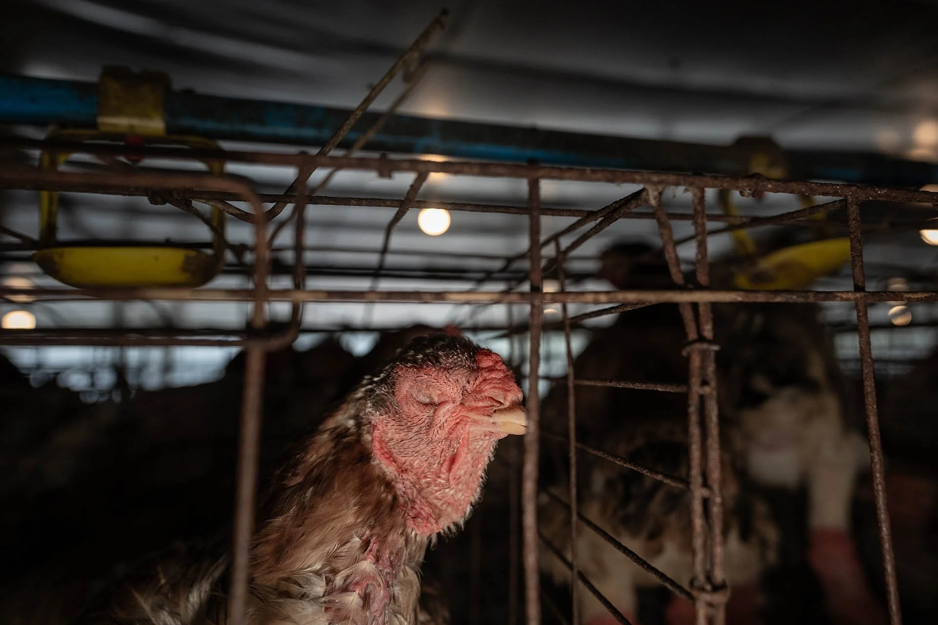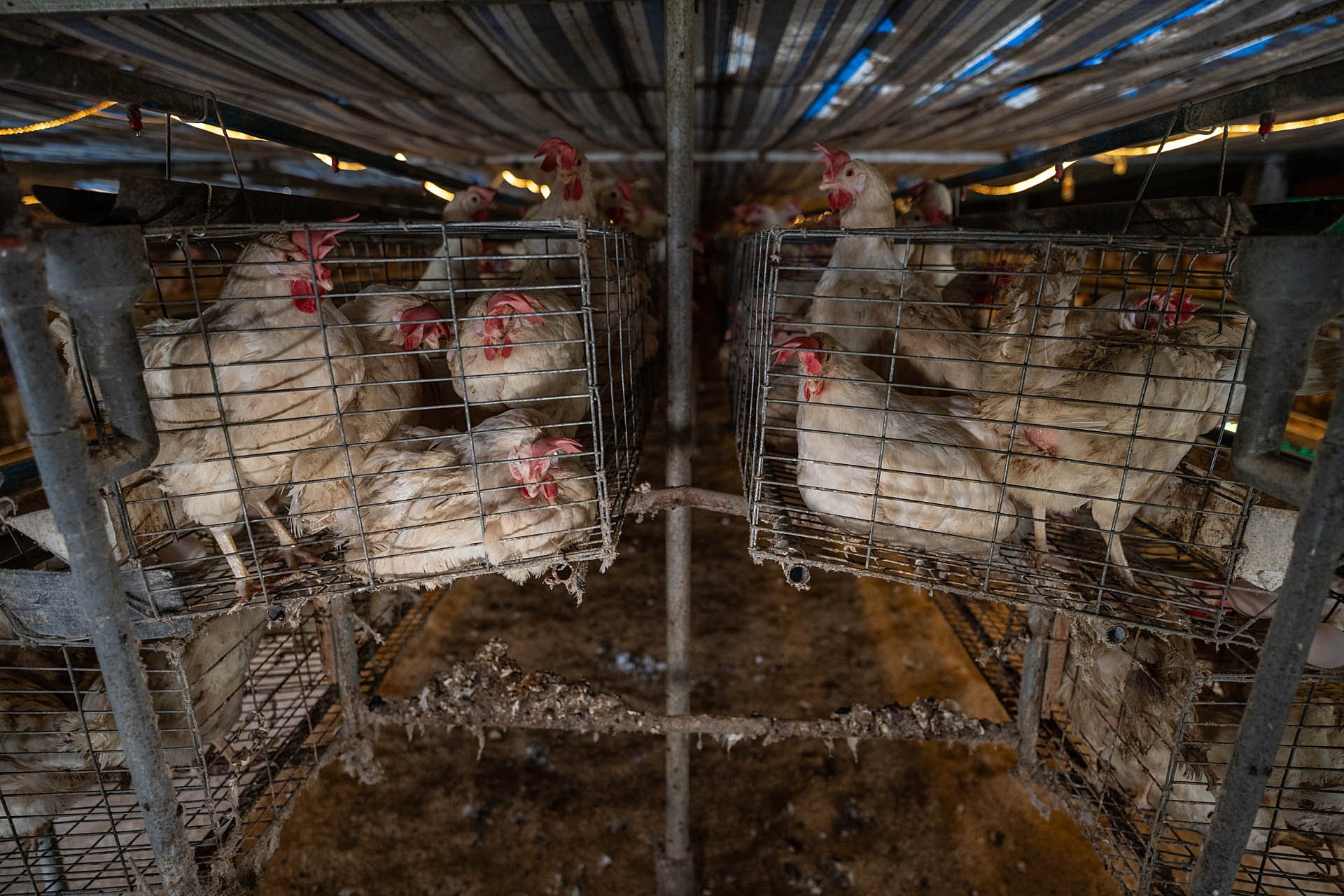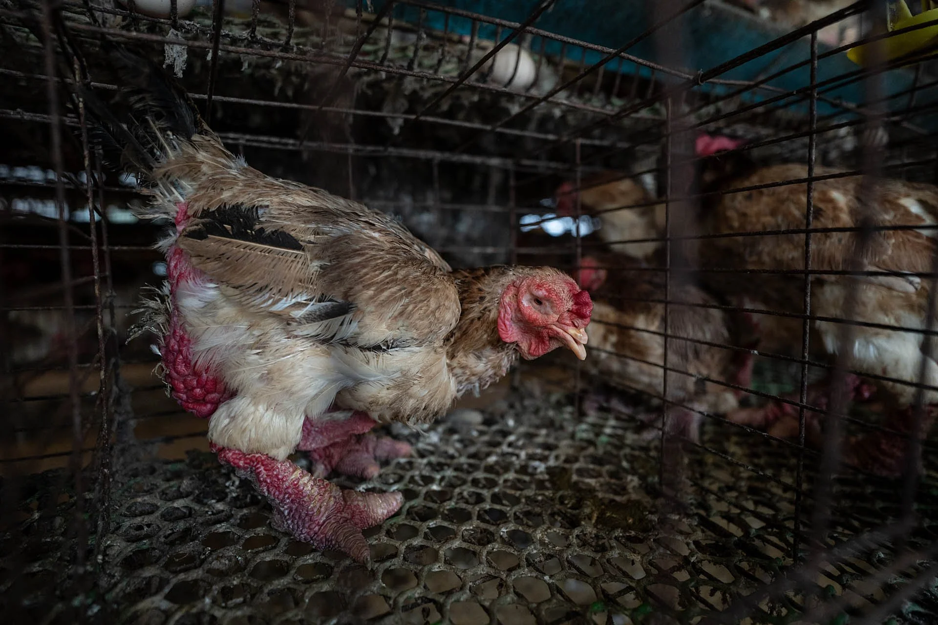 Los pisos de alambre de las jaulas les provocan trastornos dolorosos en las patas, garras demasiado largas y lesiones abiertas mientras que los diseños inclinados provocan molestias y lesiones crónicas.